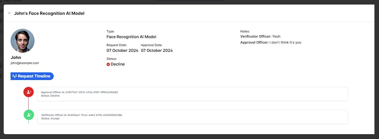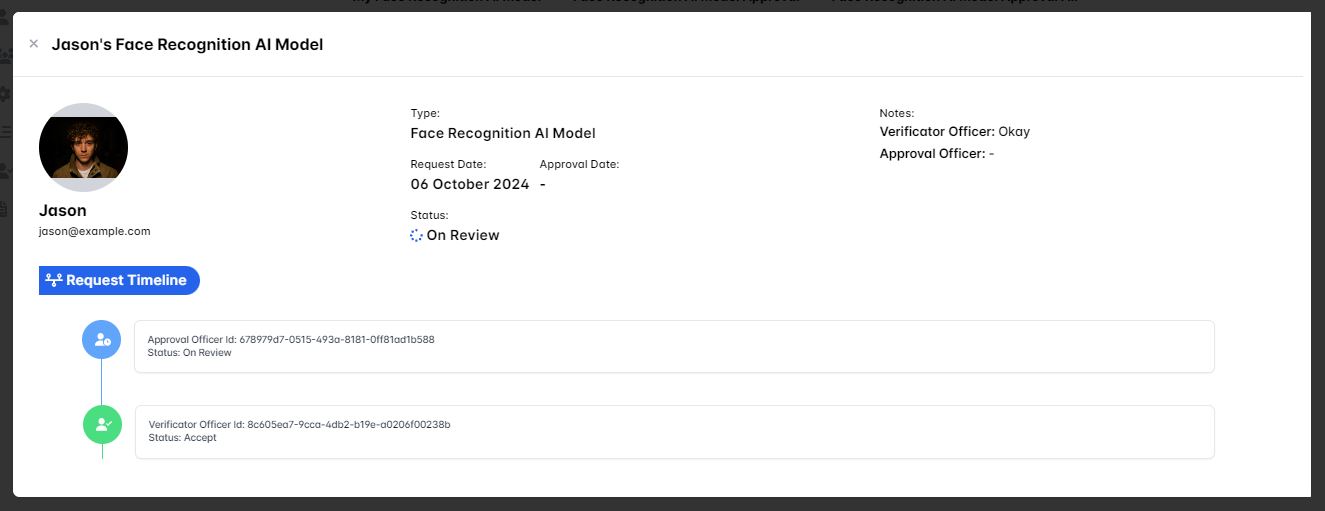 Then when you click the show detail button you'll see the request timeline is updated with the verificator officer status being Accept and your notes as the approval officer is displayed as it's prove that you're declined the requesting user Face Recognition AI Model reference image.