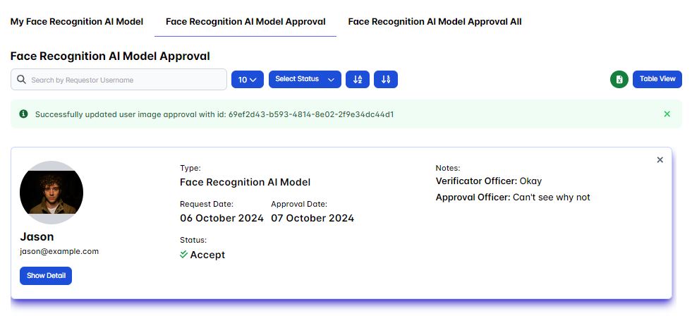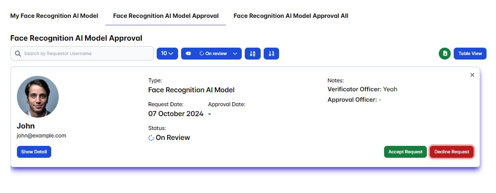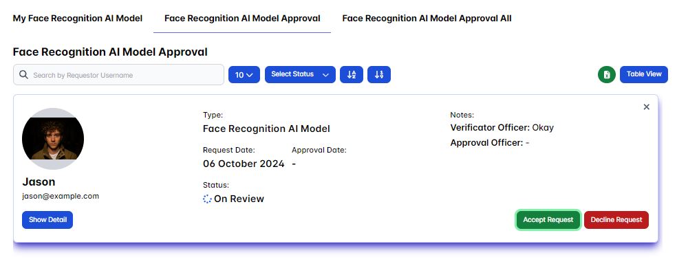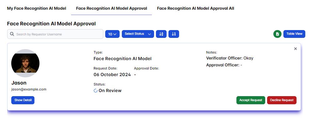 As the approval officer it's our task to either accept or decline a user request only after it's get approved/accepted by the verificator officer, you could do this in the Face Recognition AI Model Approval page section.