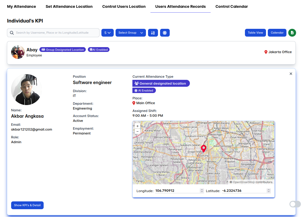 The Users Attendance Records feature allows Admin to view and manage individual user attendance details, including personal information, assigned attendance locations and shift details.