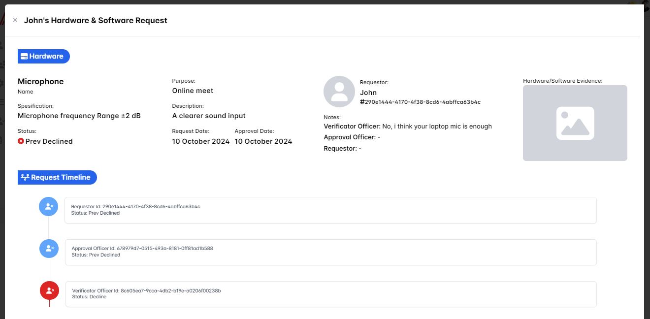Then when you click the show detail button you'll see the request timeline is updated with the Verificator Officer status being Prev Declined and your notes as the verificator officer is displayed as it's prove that you're declined the requesting user hardware/software request.