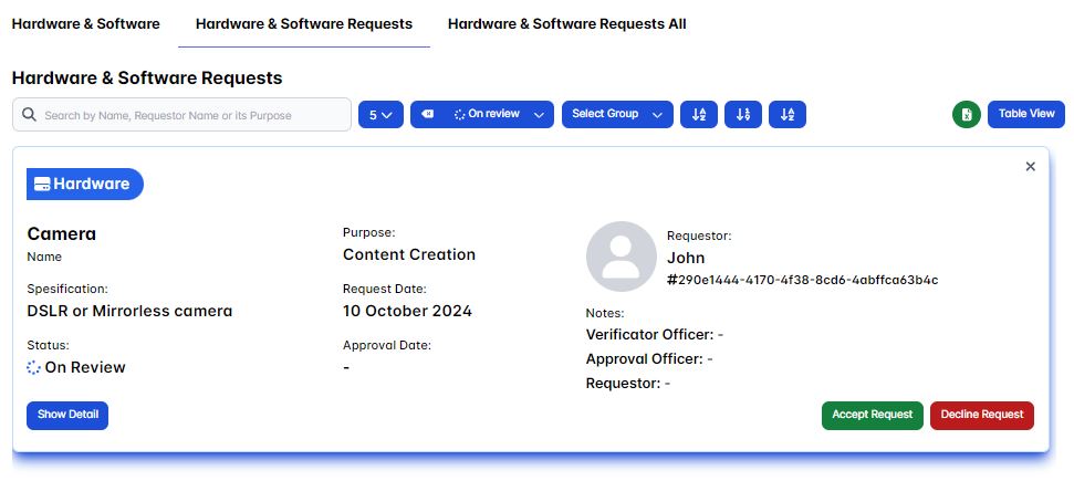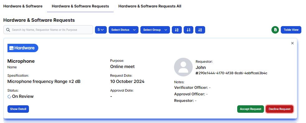 As the verificator officer it's our task to either accept or decline it's request, you could do this in the Hardware & Software Requests page section.