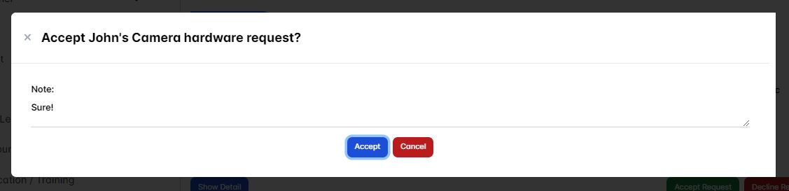 To accept/approve a user hardware/software request requested by a user click the Accept Request button.