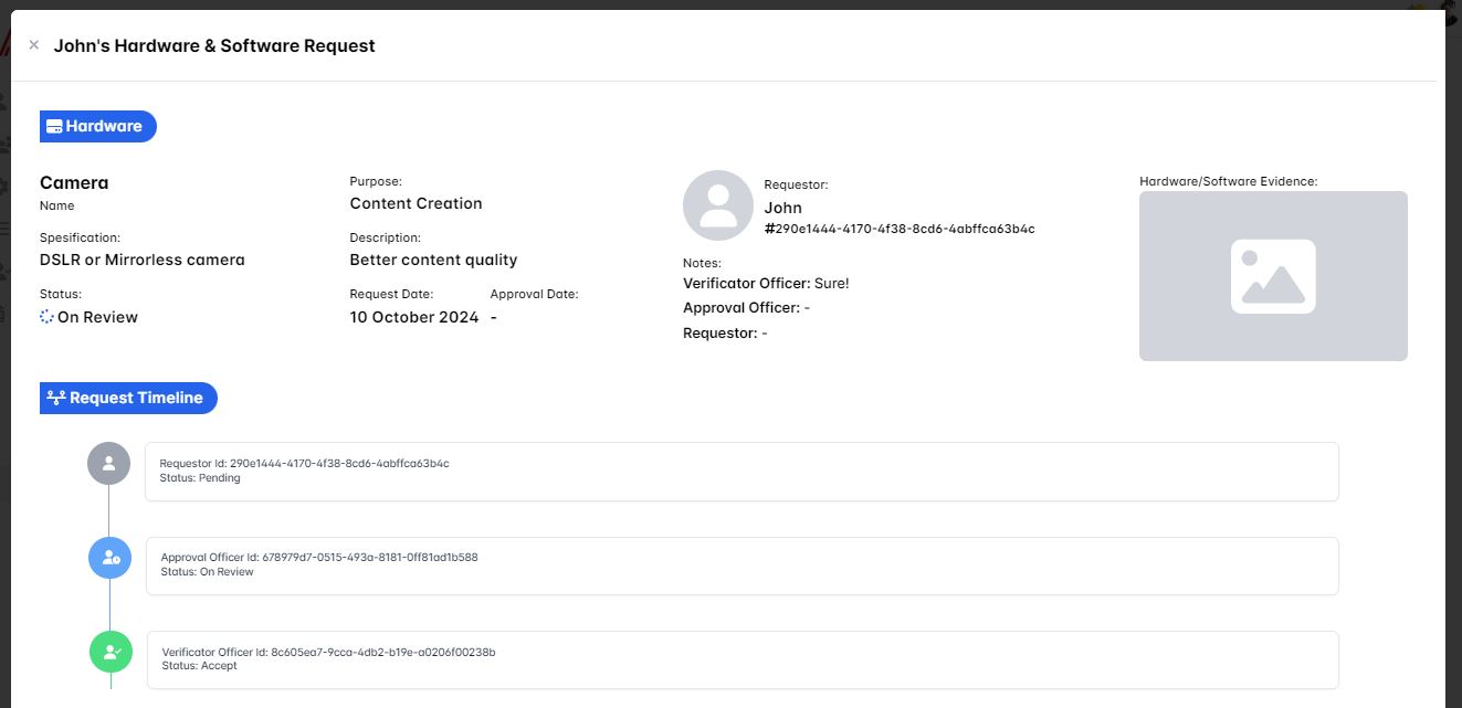 Then when you click the show detail button you'll see the request timeline is updated with the Verificator Officer status Accept and your notes as the verificator officer is displayed as it's prove that you're approved the requesting user hardware/software request.