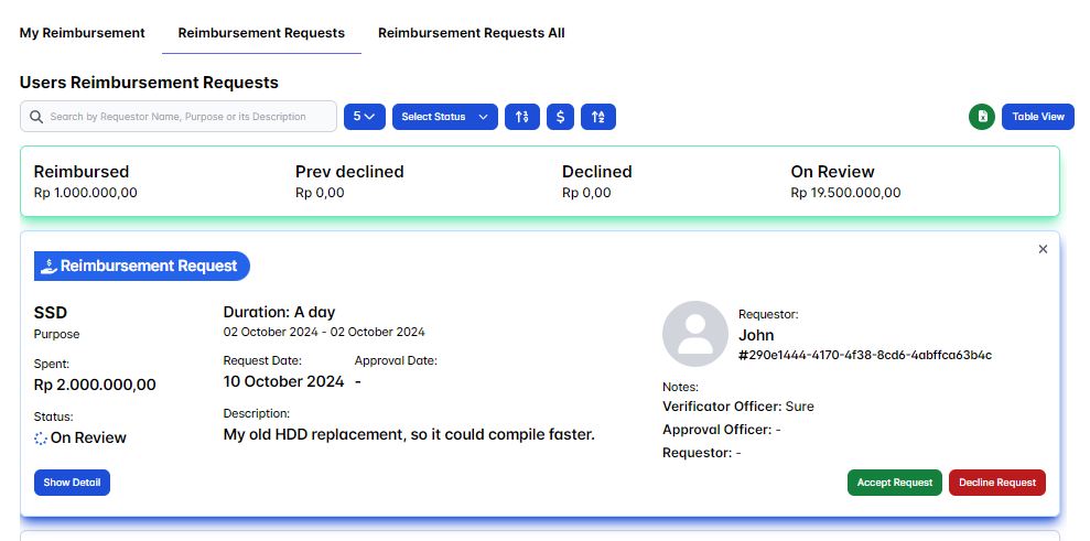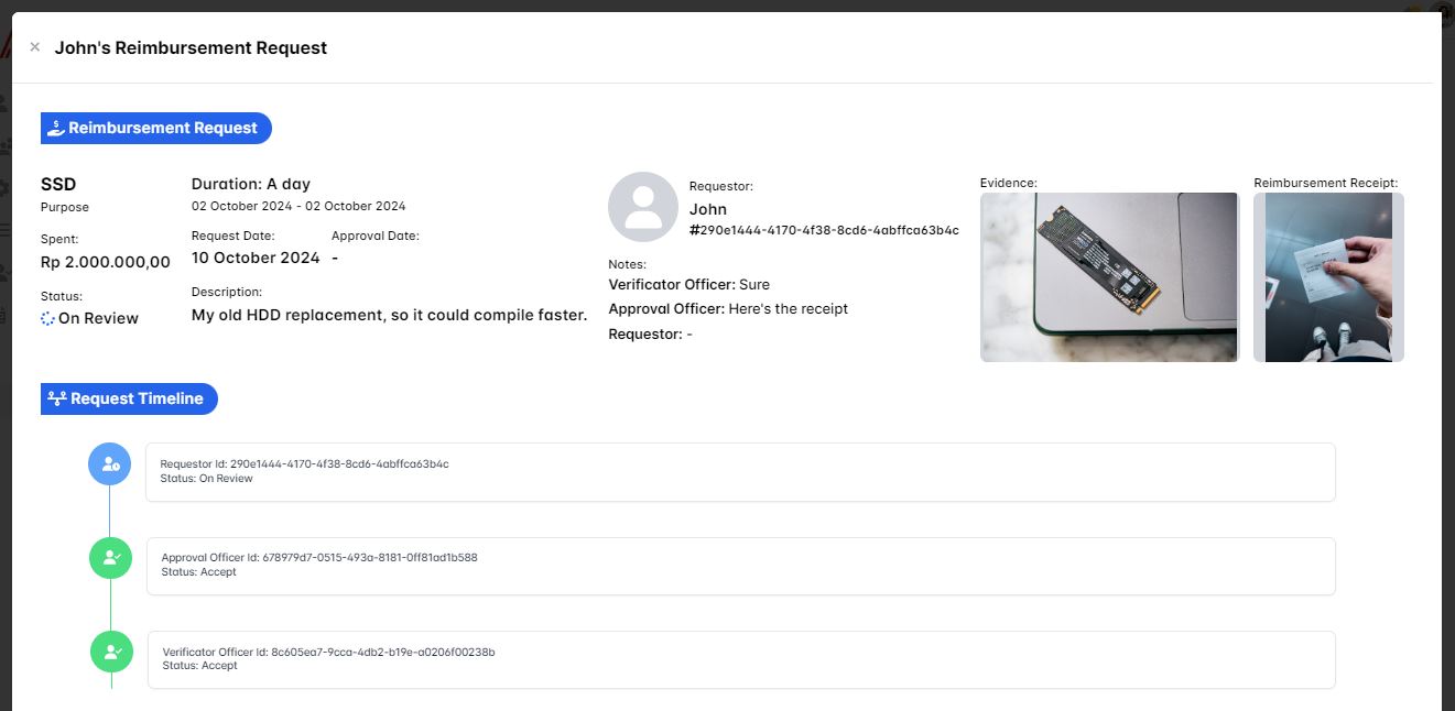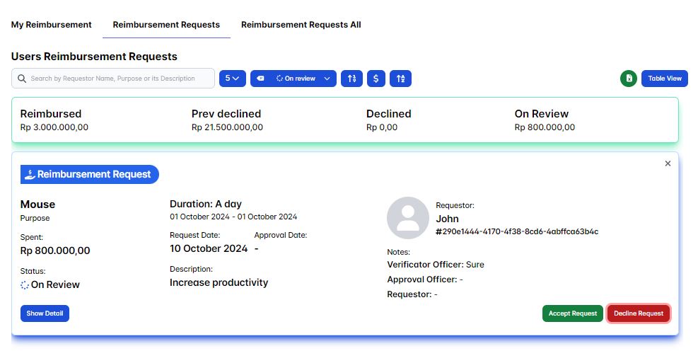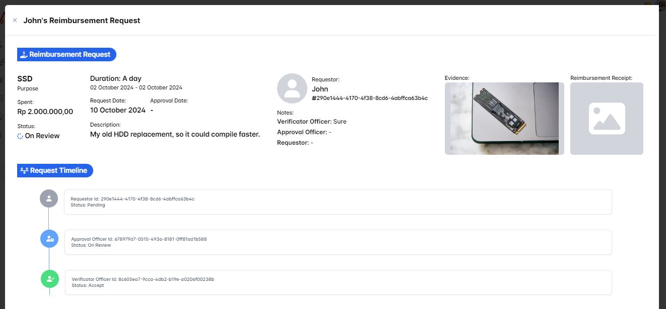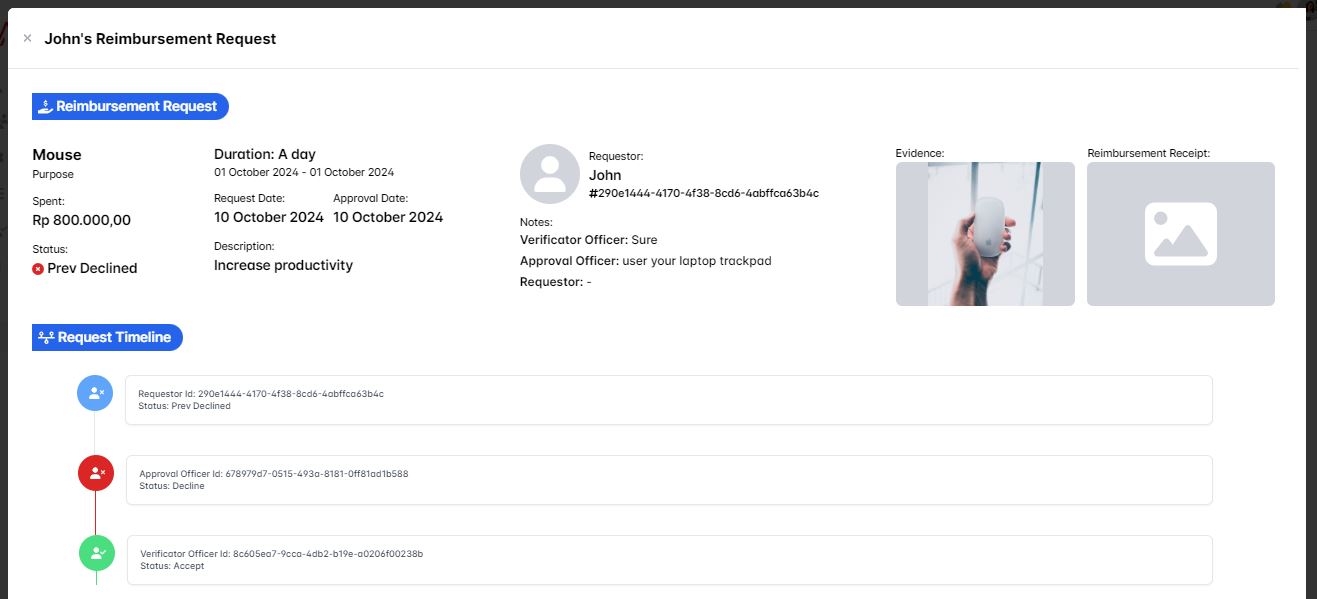Then when you click the show detail button you'll see the request timeline is updated with the verificator officer status being Accept and your notes as the approval officer is displayed as it's prove that you're declined the requesting user reimbursement request.