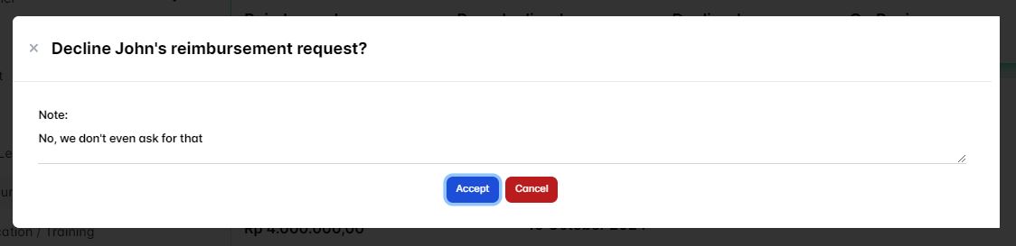 After you've satisfied then click Accept button to decline the user reimbursement request.