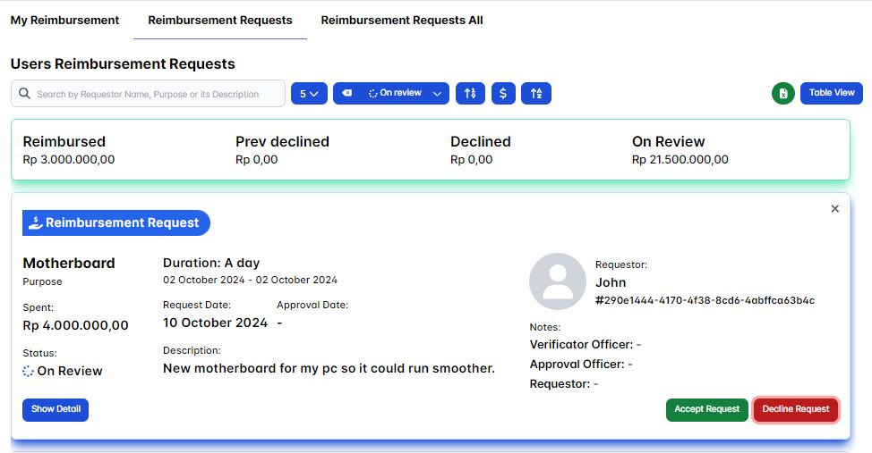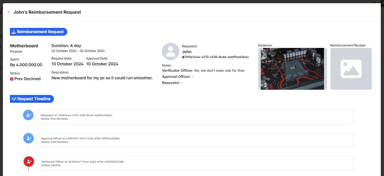 Then when you click the show detail button you'll see the request timeline is updated with the Verificator Officer status being Prev Declined and your notes as the verificator officer is displayed as it's prove that you're declined the requesting user reimbursement request.
