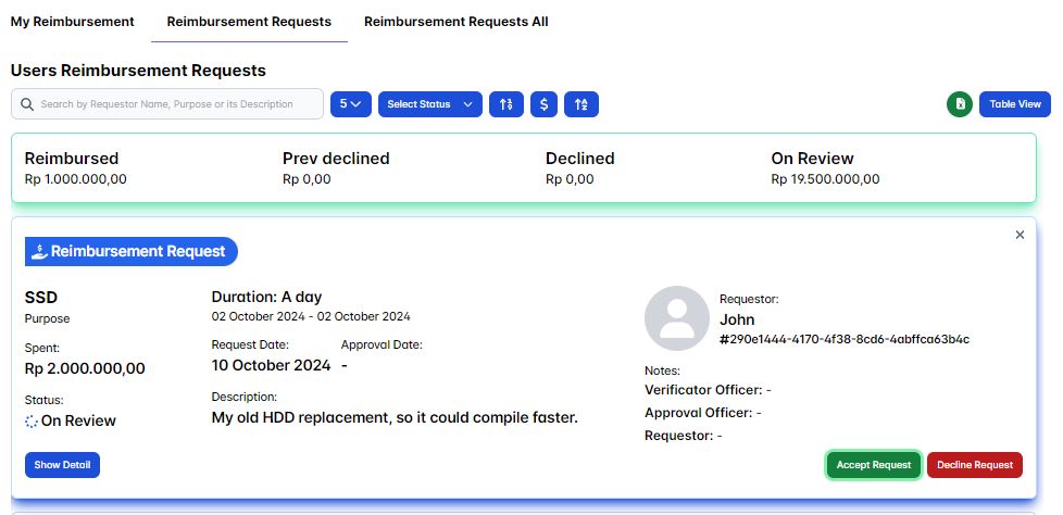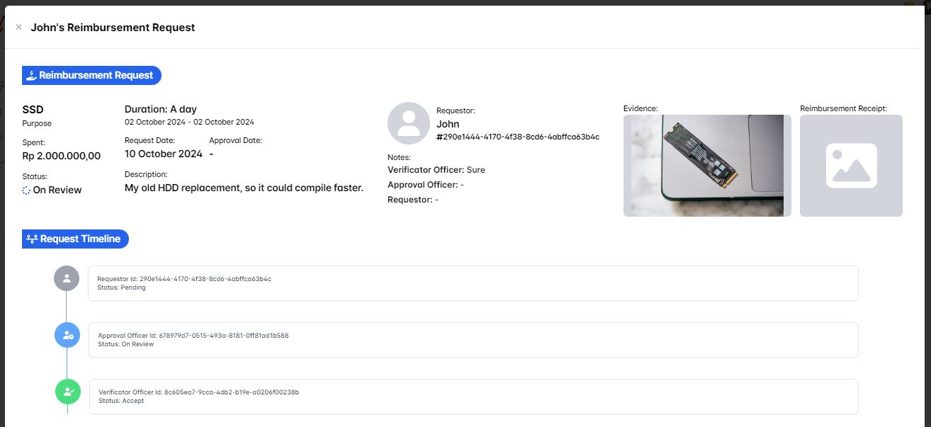 Then when you click the show detail button you'll see the request timeline is updated with the Verificator Officer status Accept and your notes as the verificator officer is displayed as it's prove that you're approved the requesting user reimbursement request.