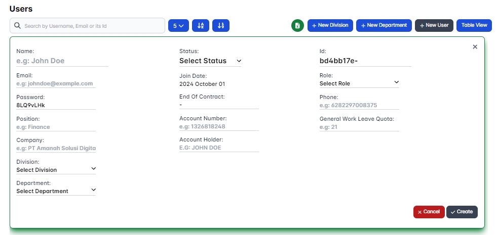 Then you'll be prompted to fill in the input form of the new user account, fill in all the blank input form such as Name of the user, it's email, position, company, status, it's account number & holder, it's main role, phone number, and the user general work leave quota.